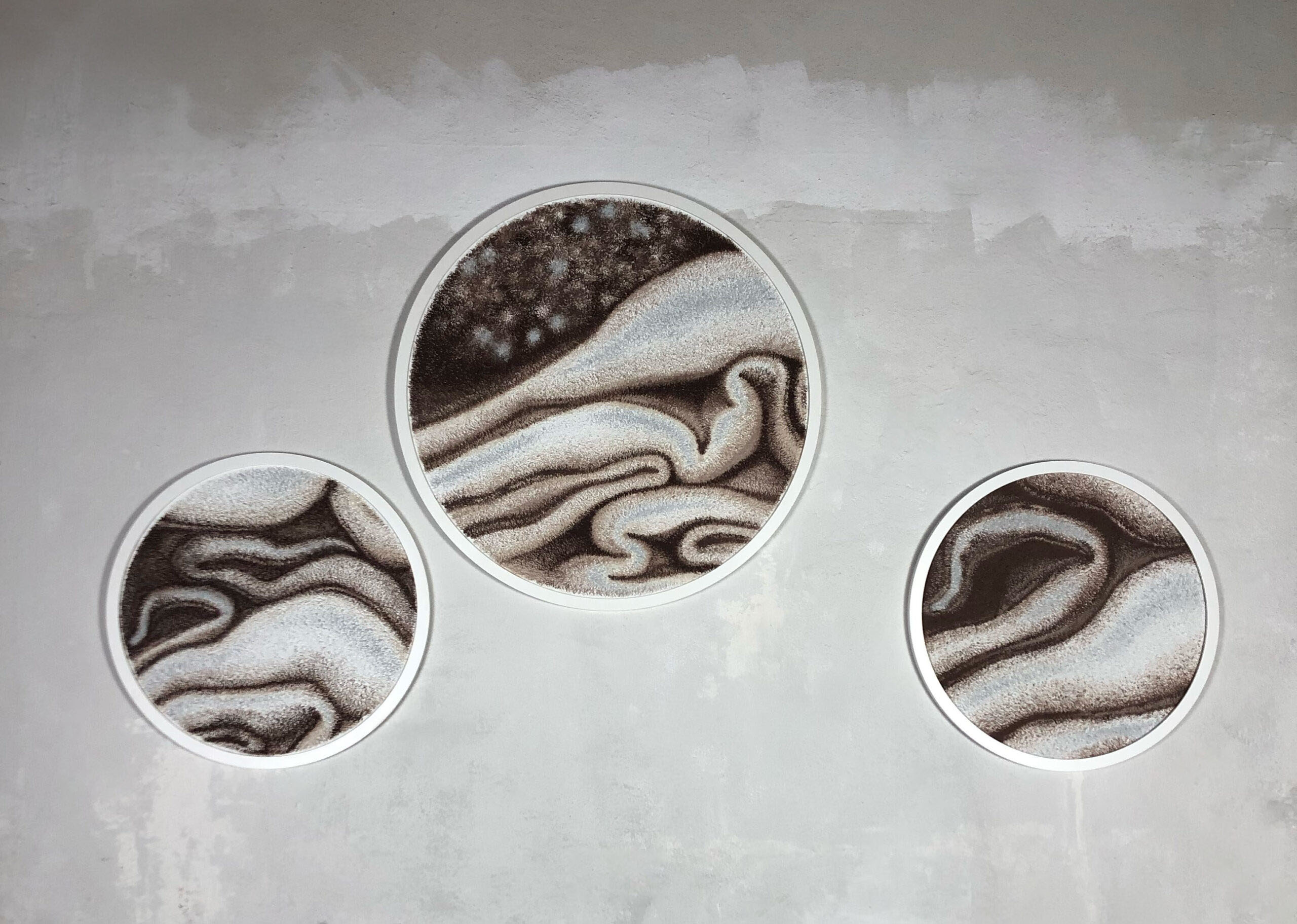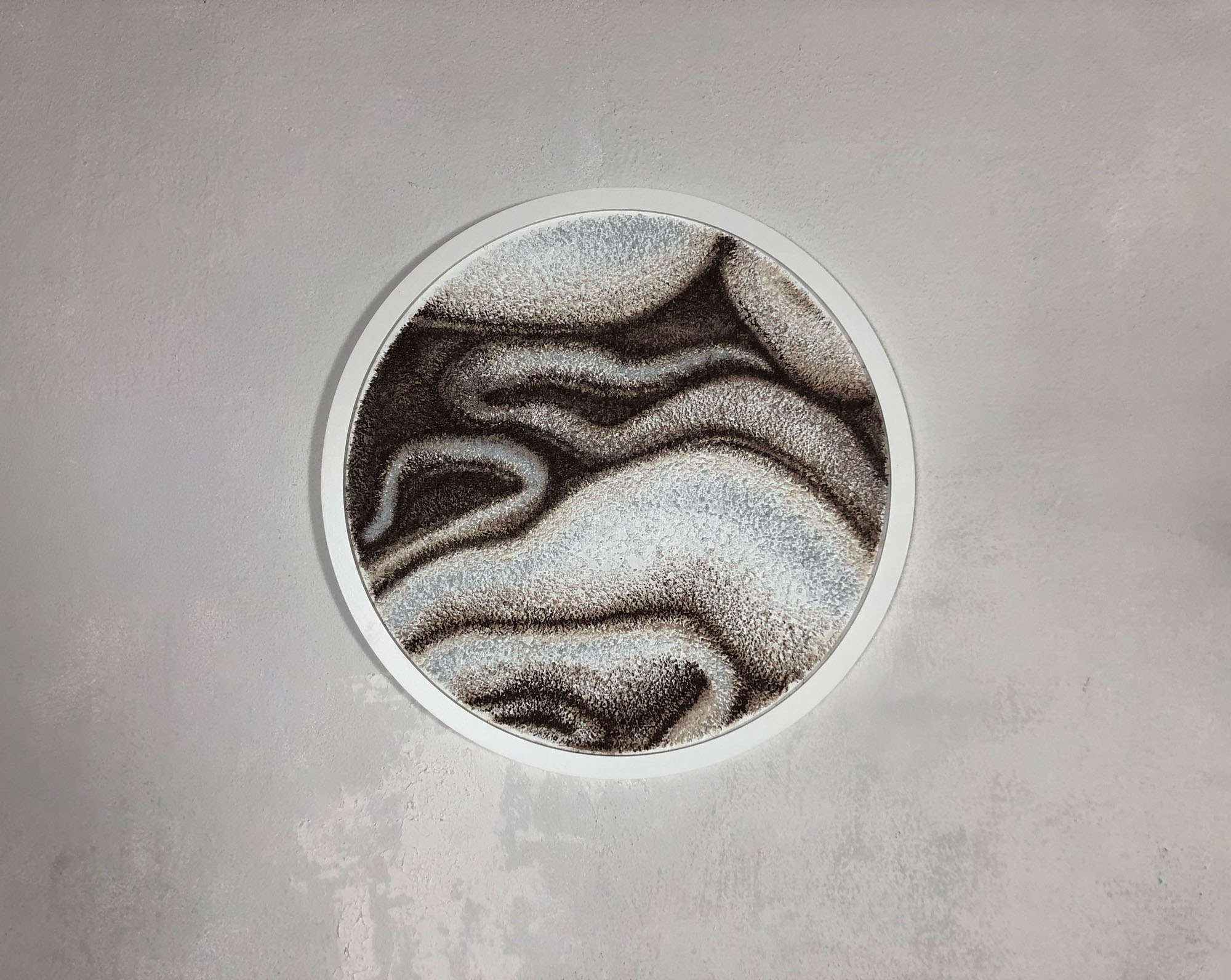 Marasmi Año 2024 Técnica Gravilla y pintura látex sobre base de contrachapado y marco de madera Tamaño ⌀ 53, 73, 53 cm